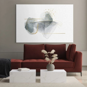 Brugen af gyldne accenter giver værket en ædel karakter og en delikat glans. Guldfarvede linjer introducerer et element af bevægelse, mens guldprikker ligner stjernestøv, hvilket giver værket en unik lethed. Kompositionen er baseret på kontraster – kølig grå kombineret med varm guld skaber en sammenhængende og attraktiv helhed. Det er den perfekte løsning for elskere af elegance, enkelhed og afdæmpede, men iøjnefaldende dekorationer.