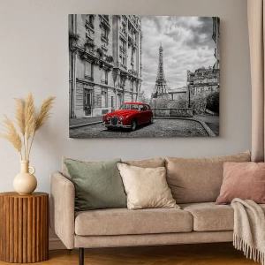 - Dette maleri forestiller en rød bil mod Eiffeltårnet i sort-hvid. Et slående dekorationsstykke, der kombinerer klassisk og moderne stil.