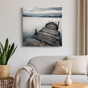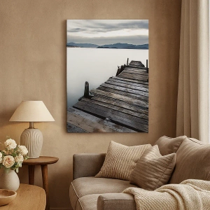 - En træmole, der fører til en rolig sø. En ideel dekoration til naturinspirerede interiører, den bringer harmoni og afslapning. Perfekt til stuer, soveværelser og loungeområder.