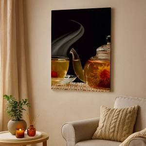 Det universelle te- og blomstermotiv passer til mange arrangementer og understreger rummets harmoni. Det førsteklasses lærred garanterer holdbarhed og sikrer, at trykket vil være et dekorativt stykke i mange år.
