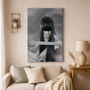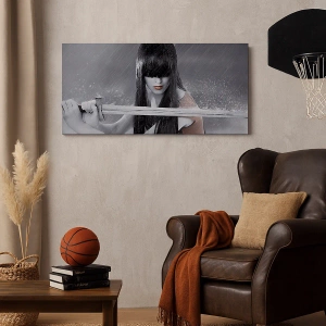 Hver detalje, fra regndråberne til sværdbladet, er præcist gengivet, hvilket skaber effekten af en realistisk scene. Motivet af en kvinde med et sværd symboliserer styrke, mod og beslutsomhed, perfekt egnet til moderne interiører.