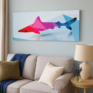 "Haj i et krystallinsk rum" er et lærredstryk på 70x50 cm, der tiltrækker opmærksomhed med sit geometriske mønster og livlige farver. Det forestiller en haj, hvis silhuet sammensat af abstrakte former skaber en dynamisk og moderne komposition. Kombinationen af nuancer af lyserød og blå giver hele værket en friskhed og energi.