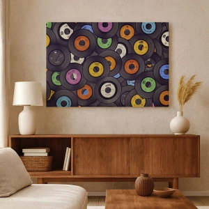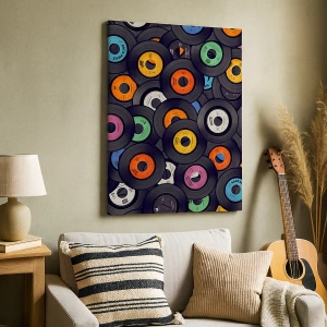 - Dette maleri forestiller farverige vinylplader i et kunstnerisk arrangement, der symboliserer en passion for musik og klassisk musik. Det er den perfekte dekoration for elskere af retro- og vintagestil.