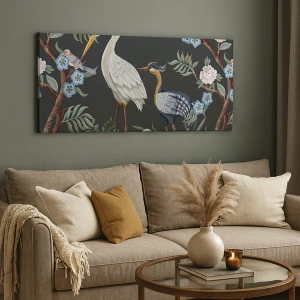 - Dette lærredstryk forestiller malede fugle omgivet af planter mod en mørk baggrund. Dette elegante design, der minder om natur og harmoni, komplementerer perfekt både klassiske og moderne interiører.