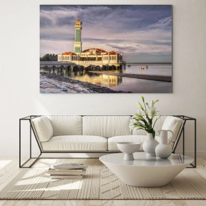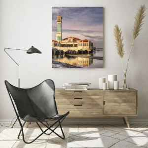 - Maleriet forestiller en imponerende moské bygget på vandet, omgivet af maleriske refleksioner og et fredeligt landskab. En perfekt accent til at bringe harmoni og kultur til interiøret.