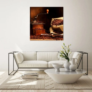 - Maleriet forestiller en gammel kaffekværn af træ omgivet af kaffebønner og en sæk fyldt med dem. Det overordnede design har et rustikt præg, der passer perfekt til klassiske interiører.
