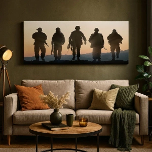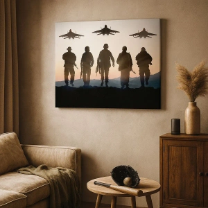 - Et maleri, der forestiller silhuetter af soldater og jagerfly mod en solnedgangsbaggrund. En komposition fyldt med styrke og beslutsomhed, perfekt til moderne og militærinspirerede interiører.