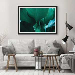 - Denne plakat viser et nærbillede af grønne blade med en distinkt struktur og tekstur. Den tropiske atmosfære, minimalismen og det dybe grønt bringer harmoni og friskhed til interiøret og komplementerer perfekt en moderne stil.