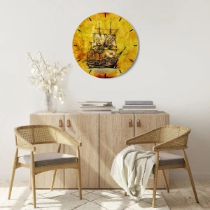 - Det grafiske sejlskibsmotiv mod en guldtonet baggrund skaber en klassisk og elegant dekorativ komposition. Dette runde ur er perfekt til vintage- eller nautisk stil.