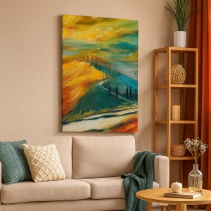 Lærredet er spændt op over rammen. Siderne og kanterne trykkes for at danne en fortsættelse af billedet. Maleriet er klar til at blive hængt op på væggen. Hvert produkt har en bøjle, der er fastgjort til rammen, og et samlesæt (skrue + dyvel).