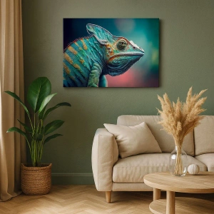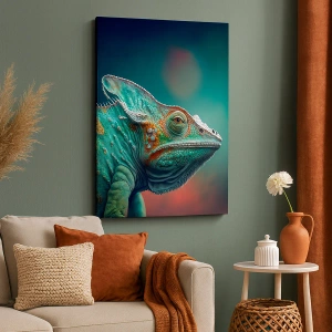 - Et lærredstryk, der forestiller en kamæleon i livlige grønne og orange farver. En slående og eksotisk komposition, perfekt til moderne interiører.
