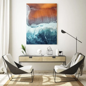 - Et fugleperspektiv over det turkisblå hav i kontrast til den orange strand. De dynamiske bølger og den rolige kystlinje skaber en unik, energisk komposition, perfekt til moderne interiører.
