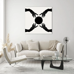 - Denne grafik viser sorte hænder arrangeret symmetrisk omkring en sort cirkel på en lys baggrund. Kompositionen kombinerer enkel form med kunstnerisk udtryk og passer perfekt ind i moderne, minimalistiske interiører.