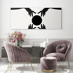 Billede på glas - Sorte hænder omkring en sort cirkel på en lys baggrund - 70x50cm - Et hemmeligt tegn - Moderne vægdekoration til stue og soveværelse ARTTOR