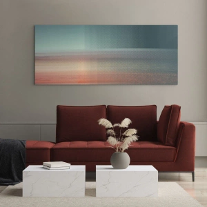 Billede på glas - En pastelfarvet abstraktion, der minder om lysbølger ved solnedgang. - 70x50cm - Abstraktion: bølger af lys - Moderne vægdekoration til stue og soveværelse ARTTOR