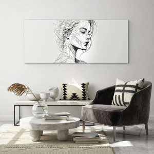 Billede på glas - En sort-hvid skitse af en kvinde med lukkede øjne i en fin linje. - 70x50cm - Portræt i drømmeri - Moderne vægdekoration til stue og soveværelse ARTTOR