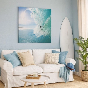 Lærredstrykket "Altid på bølgen" skildrer et dynamisk øjeblik i en surfers liv, fanget i hjertet af en kraftfuld bølge. Den blå himmel og solens stråler tilføjer dybde og lys til hele kompositionen og understreger havets skønhed og bevægelsens energi. Dette motiv afspejler ikke kun en kærlighed til vandsport, men også en passion for eventyr og nærhed til naturen.
