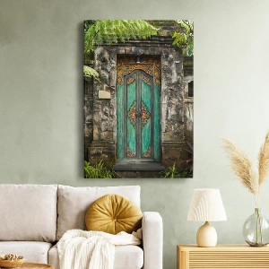 - En charmerende dekorativ dør omgivet af frodig tropisk vegetation. Den eksotiske atmosfære og den indviklede arkitektur bringer ekstraordinær harmoni og bohemestil til interiøret. Et perfekt billede til en stue eller et soveværelse.