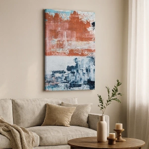 Lærredstryk - Billede på lærred - Abstraktion i hvide, blå og murstensfarver - 70x50cm - Abstrakt halvt og halvt - Moderne vægdekoration til stue og soveværelse ARTTOR