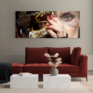 Billede på glas - En gylden venetiansk maske på en kvindes ansigt - 70x50cm - Min verden er barok - Moderne vægdekoration til stue og soveværelse ARTTOR