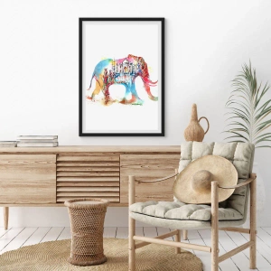 - En plakat med en farverig elefant udsmykket med indiske motiver og et billede af Taj Mahal. En unik dekoration for kunstelskere og orientalske accenter.