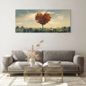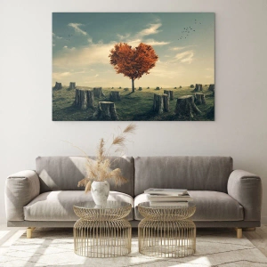 Billede på glas - Et hjerteformet træ omgivet af nedfældede stammer i en lysning - 70x50cm - Der er stadig håb - Moderne vægdekoration til stue og soveværelse ARTTOR