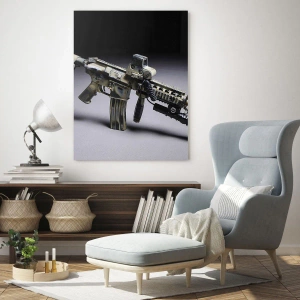 Kunstværkets omdrejningspunkt er riflen, som takket være sin realistiske gengivelse imponerer med sin præcise håndværksmæssige kvalitet. Den mørke baggrund fremhæver våbnets detaljer og giver hele kompositionen dybde og intensitet. Dette unikke dekorative element passer perfekt til interiører i loft- eller industriel stil.