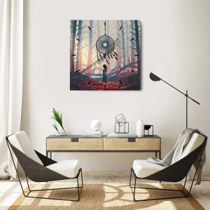 Væguret "Hemmelig Ritual for Lykke" er en ekstraordinær komposition, der transporterer beskueren til drømmenes, spiritualitetens og den skjulte magis verden. Det forestiller en figur i en mystisk skov, der kigger på en enorm drømmefanger, der svæver mellem træerne.