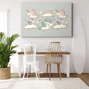 Lærredet er spændt op over rammen. Siderne og kanterne trykkes for at danne en fortsættelse af billedet. Maleriet er klar til at blive hængt op på væggen. Hvert produkt har en bøjle, der er fastgjort til rammen, og et samlesæt (skrue + dyvel).
