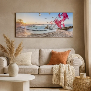 Lærredet er spændt op over rammen. Siderne og kanterne trykkes for at danne en fortsættelse af billedet. Maleriet er klar til at blive hængt op på væggen. Hvert produkt har en bøjle, der er fastgjort til rammen, og et samlesæt (skrue + dyvel).