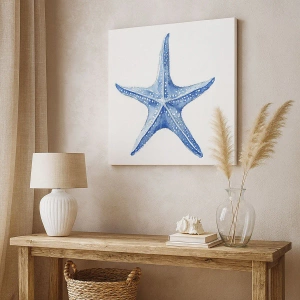 Trykket er lavet på lærred af høj kvalitet og garanterer holdbarhed og farveintensitet. Kontrasten mellem den blå søstjerne og den hvide baggrund understreger kompositionens klarhed, samtidig med at det introducerer ro og subtilitet. Motivets enkelhed gør dette tryk til et alsidigt dekorativt element.