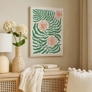 - Et minimalistisk maleri, der forestiller grønne blade med blomster i orange nuancer. Perfekt til moderne interiører, det bringer harmoni og subtilitet.
