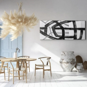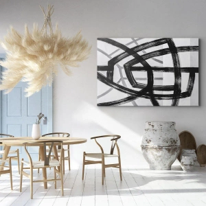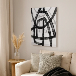 • Et abstrakt maleri, der forestiller sorte og hvide linjer, der krydser hinanden på en lys baggrund. Et minimalistisk og moderne motiv, perfekt til interiør, der tilføjer klarhed og harmoni til et rum. En perfekt dekoration for elskere af samtidskunst.