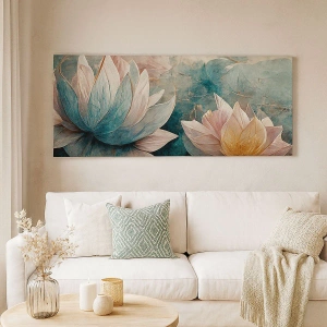 Lærredet er spændt op over rammen. Siderne og kanterne trykkes for at danne en fortsættelse af billedet. Maleriet er klar til at blive hængt op på væggen. Hvert produkt har en bøjle, der er fastgjort til rammen, og et samlesæt (skrue + dyvel).
