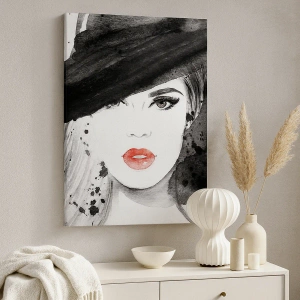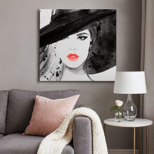 Vægkunst - Dame i sort - Portræt af en kvinde med hat og røde læber