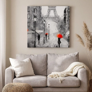 - En romantisk gadescene, der forestiller parisiske gader med udsigt til Eiffeltårnet. Røde paraplyer bringer billedet til live og tilføjer intensitet til den monokromatiske stil.
