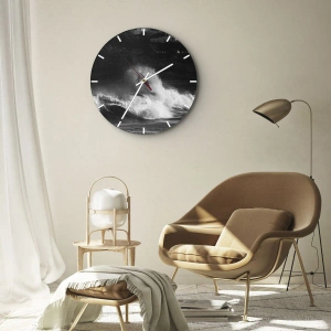 Vægur "Udfordring accepteret!" er en dynamisk scene, der viser en surfer, der overvinder en kraftig bølge. Uret er dekoreret i en kontrasterende sort-hvid stil og tiltrækker øjet med sin intensitet og grafiske præcision. Perfekt til interiører, hvor energi og karakter tæller.