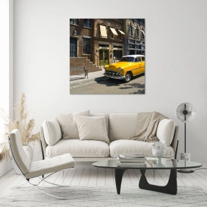 Billede på glas - En gul taxa på baggrund af et klassisk lejlighedshus - 70x50cm - Der var engang i Amerika - Moderne vægdekoration til stue og soveværelse ARTTOR