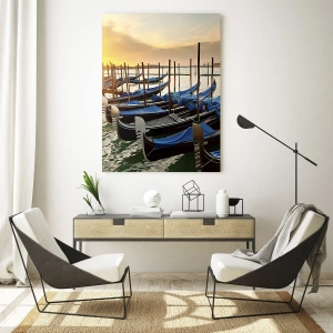 Maleriet er lavet på glas og måler 70x50 cm, hvilket giver det et moderne udseende og enestående farvedybde. Glastrykteknologien muliggør den højeste præcision i detaljer – fra lysrefleksioner på vandet til teksturen af træmoler og de slanke silhuetter af gondoler. Refleksionen forstærker følelsen af rum og realisme.