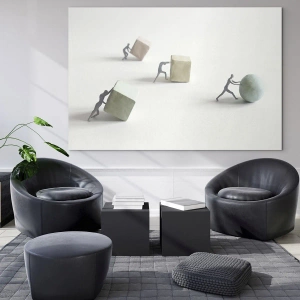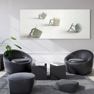 Billede på glas - Miniaturefigurer ruller og skubber geometriske former. - 70x50cm - Selve livet - Moderne vægdekoration til stue og soveværelse ARTTOR