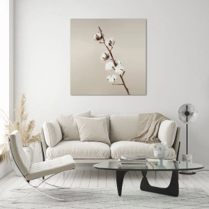 Billede på glas - En kvist bomuld på en lys, minimalistisk baggrund - 70x50cm - Ved kilden til blødhed - Moderne vægdekoration til stue og soveværelse ARTTOR