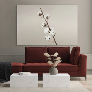 - Maleriet forestiller en enkelt bomuldskvist mod en lys beige baggrund. Den enkle komposition og de dæmpede farver skaber en rolig, naturlig atmosfære, perfekt til moderne og minimalistiske interiører.
