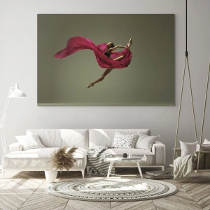 Denne kunstneriske vision indfanger skønheden og passionen ved dansen. Danseren portrætteres ved højdepunktet af sit spring, hvilket giver indtryk af, at tiden stopper. Hendes krop danner en elegant bue, og det flagrende stof tilføjer drama og flydende væske til billedet. Det fuchsia-agtige materiale tiltrækker øjet og står i kontrast til den solide baggrund, hvilket forstærker kompositionens følelsesmæssige budskab.