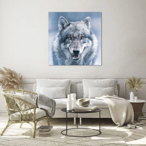 Billede på glas - En ulv med et gennemtrængende blik mod baggrunden af en snedækket skov - 70x50cm - Vil du tage udfordringen op? - Moderne vægdekoration til stue og soveværelse ARTTOR