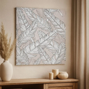 Maleriets omdrejningspunkt er de delikate, grafiske bananblade, der præsenteres i en præcis og udtryksfuld stil. Bladenes arrangement skaber et dynamisk, men harmonisk mønster, der tiltrækker opmærksomhed og giver kompositionen et kunstnerisk udtryk. Monokromatiske farver understreger designets enkelhed og elegance.