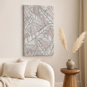Lærredstryk - Billede på lærred - Sort og hvidt mønster med bananblade på en lys baggrund - 70x50cm - Fjerlig uro - Moderne vægdekoration til stue og soveværelse ARTTOR