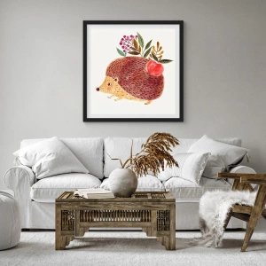 Plakat i sort ramme - Et sødt pindsvin med et æble og kviste på en lys baggrund - 50x70cm - Og du kan allerede lide mig - Moderne vægdekoration til stue og soveværelse ARTTOR