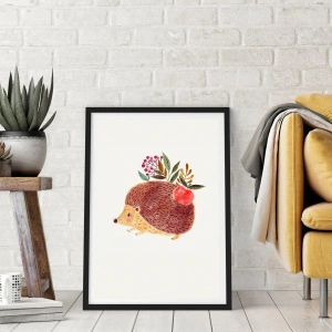 - Denne plakat forestiller et charmerende pindsvin, der bærer et æble og kviste på ryggen, gengivet i en delikat akvarelteknik. Varme farver og en diskret illustrationsstil giver den en unik, eventyrlig følelse.