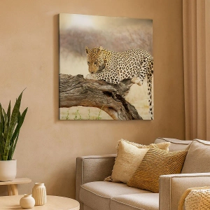 - Dette maleri forestiller en leopard, der hviler på en tør træstamme, omgivet af den afrikanske savannes landskab. Det er et perfekt motiv til interiør inspireret af natur og dyreliv.