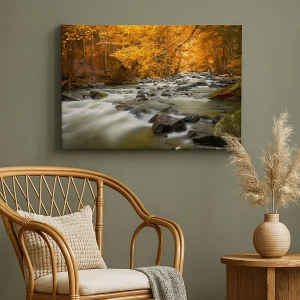 Lærredstryk - Billede på lærred - Et vandløb i den gyldne skov - 100x40 cm